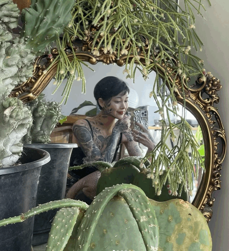 全身と顔にタトゥーを入れた女性彫師のさくらさん。
